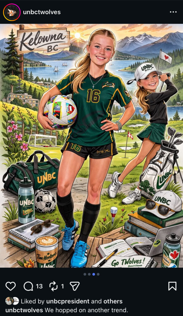 It is beyond disappointing to see the UNBC Timberwolves social media filled with AI-generated trends. The most recent example is the AI caricature trend.