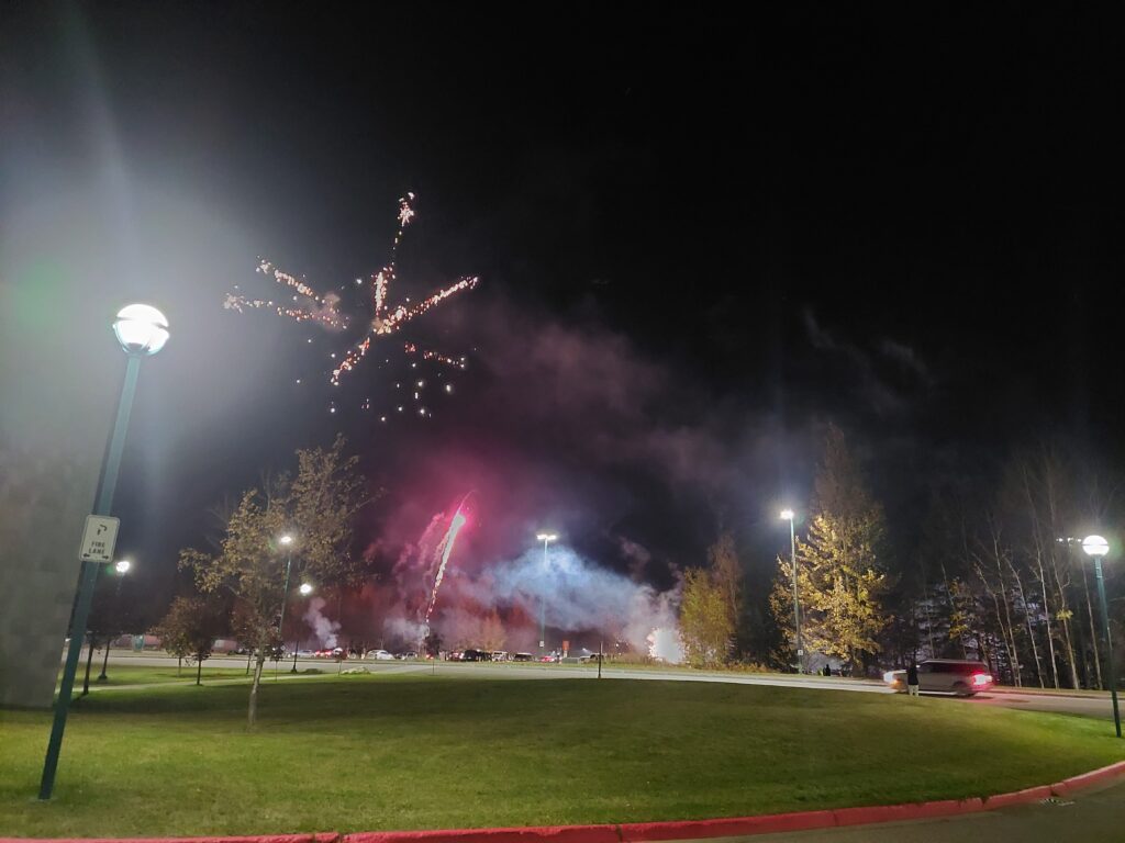 Although many Diwali events in Prince George are held in mid-October, such as dance parties and performances, the community spirit continued strong into October 20. On that Monday evening, participants gathered in a safe outdoor location cleared of trees and flammable hazards. The result was a dazzling, well-controlled show: an extended evening of fireworks, crackling firecrackers, and other luminous displays, all choreographed to delight and amaze.