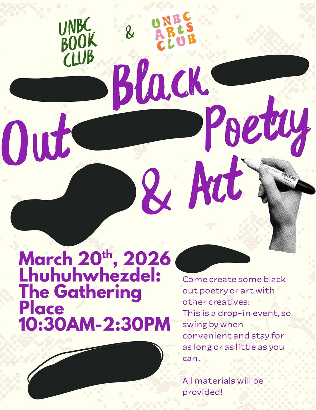 Come create some black out poetry or art with other creatives! This is a drop-in event, so swing by when convenient and stay for as long or as little as you can. All materials will be provided.