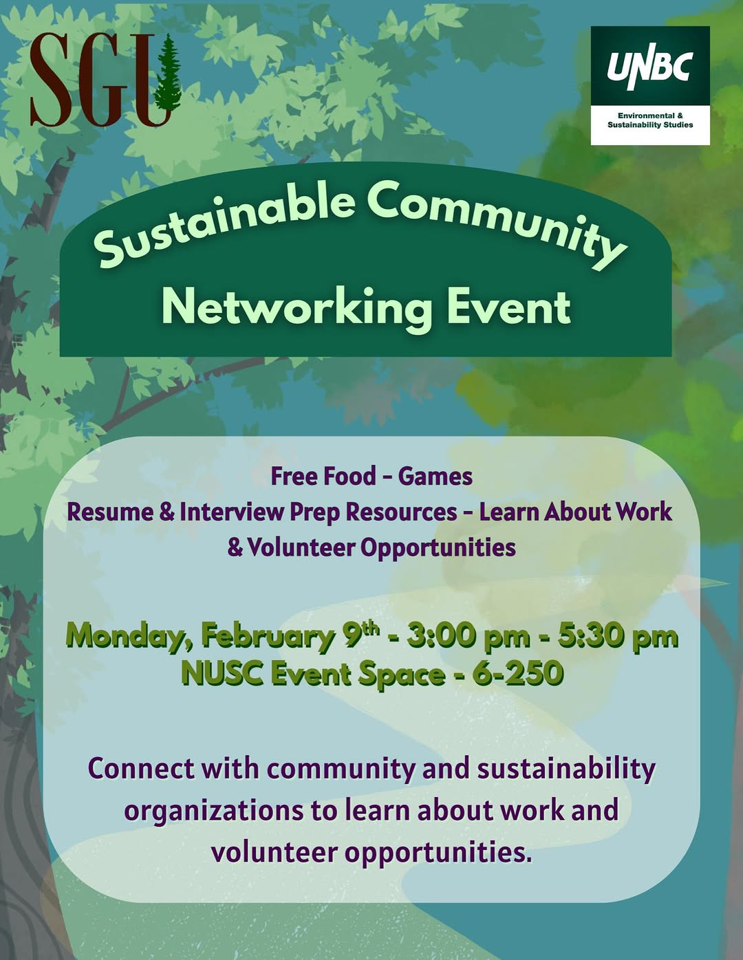 Free food, games, sustainability activities, and an opportunity to connect with local organizations and alumni working on community and environmental issues: join us February 9th from 3:00 – 5:30 in the NUSC Event Space for an opportunity to connect with sustainability and community minded people and organizations. This drop in event welcomes everyone curious about sustainability and community action! Check out resources for building resumes and preparing for interviews, and talk to folks already working in the field.
