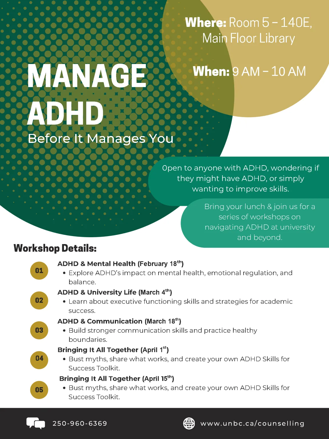 Please join this free biweekly psychoeducational workshop series that is hosted by Maria Walsh from Counselling Services. Maria Walsh is an experienced counsellor with over 2 decades of experience and also lives with ADHD herself. Each session has their own unique topic and there is no commitment necessary! You can join in for all sessions or only on the dates that interests you. If you are interested, please refer to the poster for more specific details on each session. See you there!