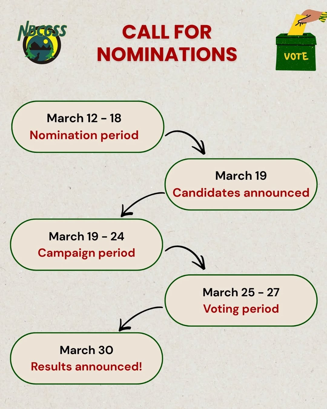 The NBCGSS Board of Directors Election. Starting March 12, head to the NBCGSS Office (7-168) from 9 AM to pick up your nomination form. This is your chance to shape the future of grad student life at UNBC! Every grad student voice matters — run, vote, and make a difference!