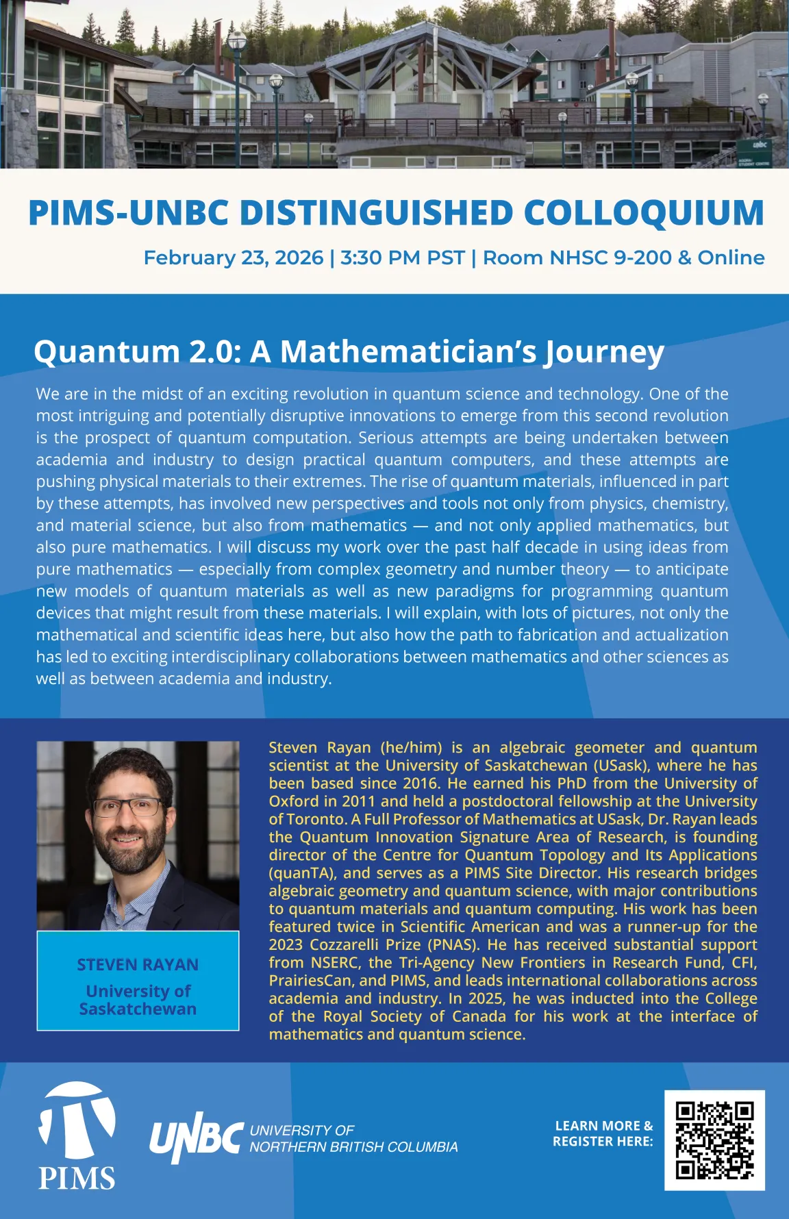 PIMS-UNBC Distinguished Colloquium & FSE Colloquium: Steven Rayan, Director, Centre for Quantum Topology and Its Applications (quanTA) and Professor, Mathematics and Statistics, University of Saskatchewan