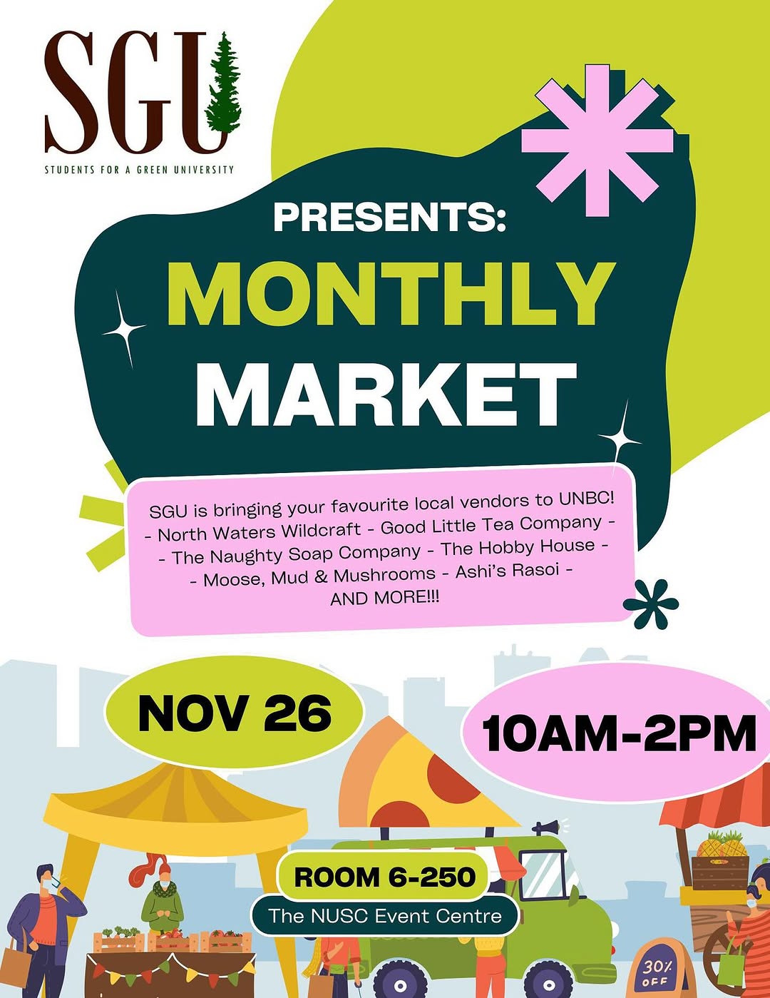 SGU is bringing your favourite local vendors to UNBC! North Waters Wildcraft – Good Little Tea Company – The Naughty Soap Company – The Hobby House – Moose, Mud & Mushrooms – Ashi’s Rasoi – AND MORE!!!