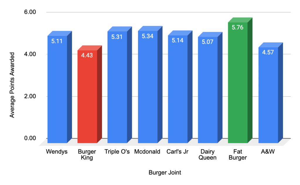 Fatburger’s Original Fatburger with Cheese, while scoring high on taste with an average of 5.76 points, was the priciest at $2.12 per point due to its $12.18 price tag. It might be worth the occasional splurge, but it’s not the most economical choice for students.