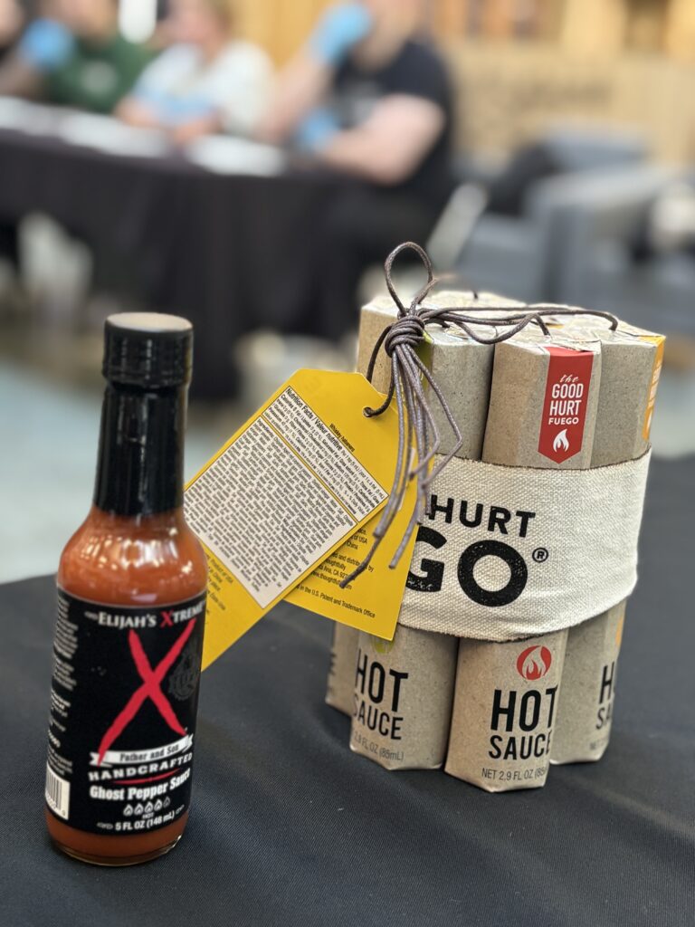 First place won a $50 gift basket. Second place got a bottle of hot sauce. First aid was available, and after completion or elimination, participants got milk or yogurt for cooling plus napkins and hand wipes.