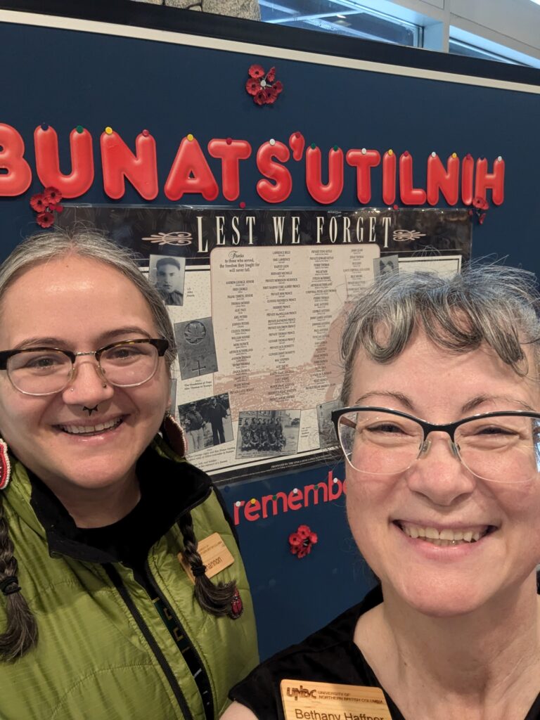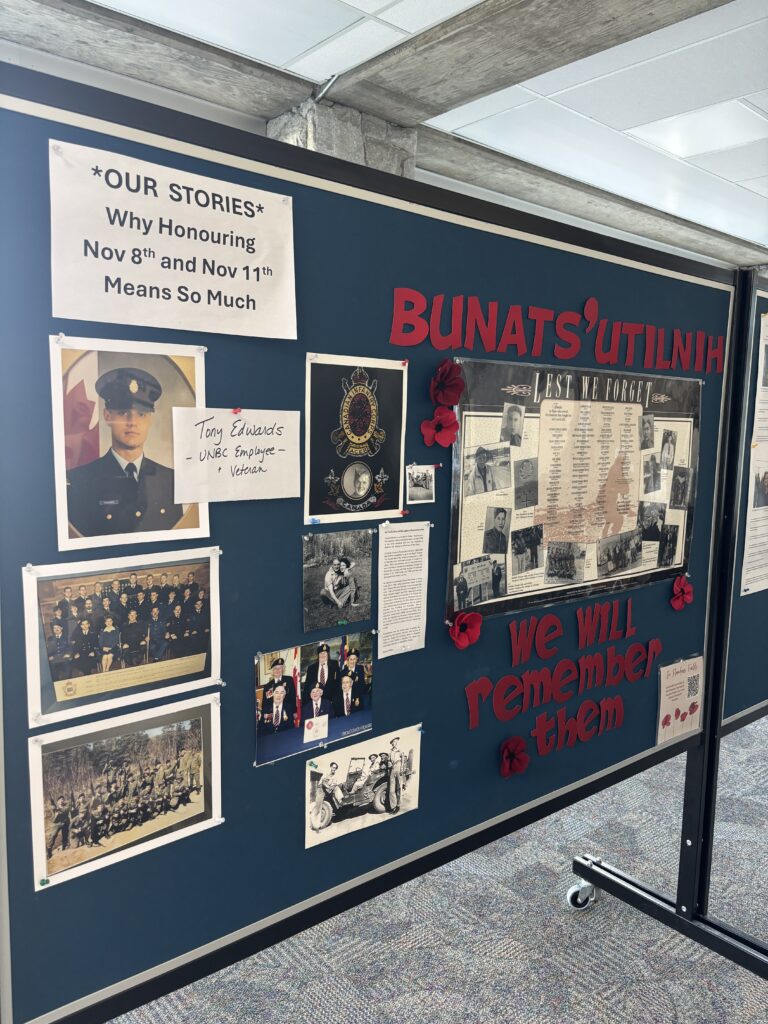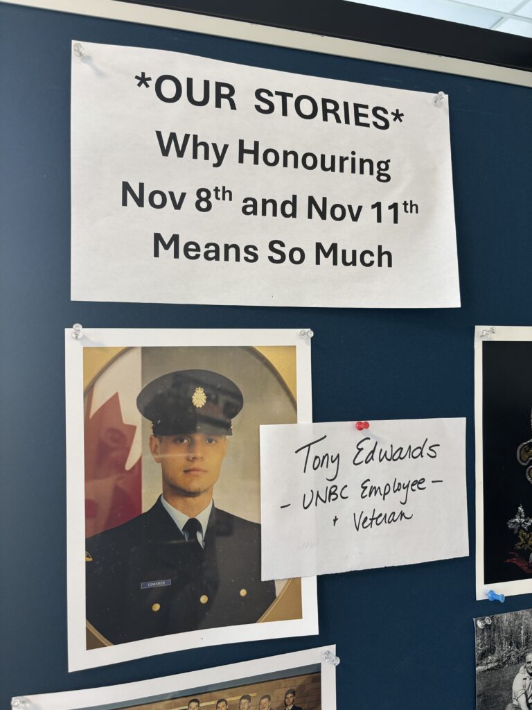 Shannon MacKay, UNBC’s Indigenous Cultural Connections Coordinator, and Bethany Haffner, UNBC staff member, put together the “UNBC Remembers” display. What caught my attention was how personal it was. Haffner’s father-in-law served in WWII, and there was a UNBC employee named Tony Edwards who’s also a veteran.
