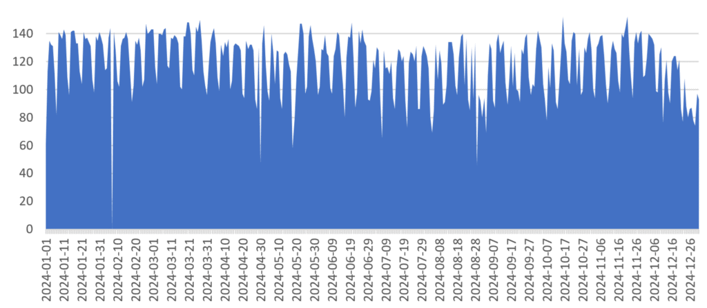 Since May 2022, NBCGSS has invested significant resources each year to provide premium Grammarly services to all graduate students at no cost. Due to the limited number of available user accounts, it is important for NBCGSS to monitor the number of active Grammarly users among students. From May 2022 to February 2025, there has been a consistent increase in the number of active Grammarly members, indicating a growing dependence on the platform for writing support among graduate students. Figure 1 illustrates the daily usage of Grammarly by UNBC graduate students throughout 2024. As shown in Figure 1, of the 250 accounts purchased by NBCGSS, the maximum recorded usage was 156 active accounts in one day, indicating that 94 accounts were inactive each day. As illustrated in Figure 2, the average number of active users was less than 100, so the average number of inactive users was more than 150 each day.