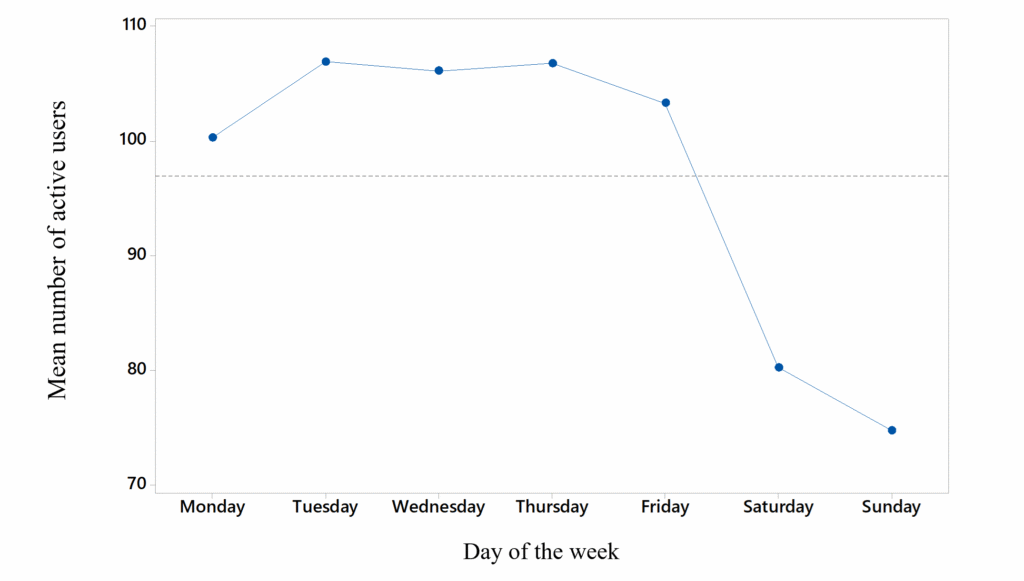 Peak Days: Tuesdays, Wednesdays, and Thursdays consistently exhibit the highest number of active users. This likely corresponds to academic schedules and deadlines, which are typically concentrated in the middle of the week. This trend is evident in various means and over 95% of the week’s trends.